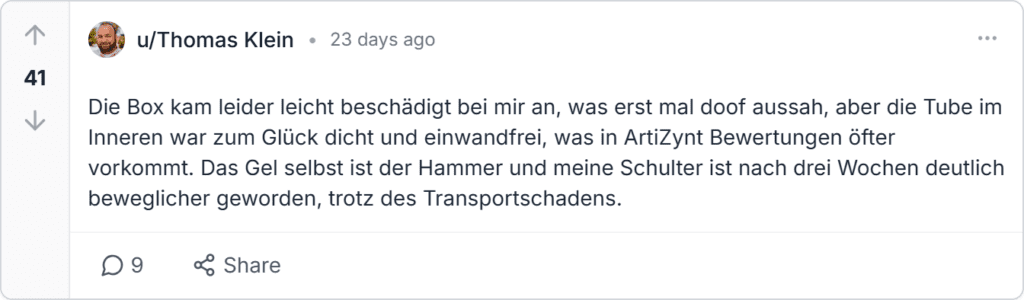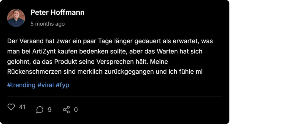 ArtiZynt Bewertungen und Beschwerden aus Deutschland stammen von Trustpilot, Amazon.de, gutefrage.net und Reddit, mit einer Gesamtbewertung von 4,9 Sternen aus tausenden verifizierten Erfahrungen, ähnlich wie bei ArtiZynt kapseln Erfahrungen.