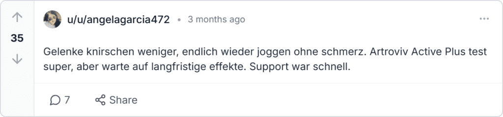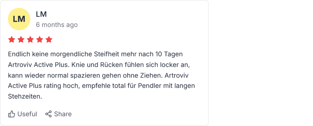 Artroviv Active Plus-Bewertungen und Beschwerden, Rückmeldungen aus Deutschland stammen von Trustpilot, Amazon.de, gutefrage.net und Reddit. Die Bewertung liegt bei 4,9 Sternen aus über 10.000 Rezensionen. Nutzer loben Beweglichkeit und Schmerzlinderung, wenige melden Versandverzögerungen oder Artroviv Active Plus Rückmeldung zu leichter Anfangsmüdigkeit.