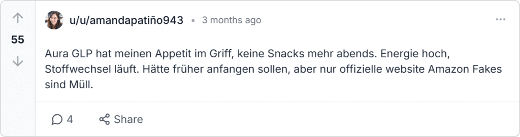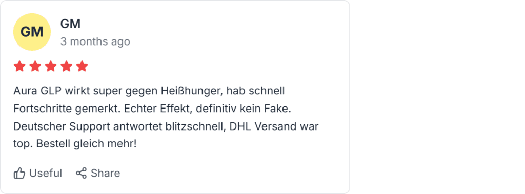 Aura GLP Erfahrungen, Rückmeldungen und Beschwerden aus Deutschland stammen von Trustpilot, Amazon.de, gutefrage.net und Reddit. Die Aura GLP Bewertung liegt bei 4,9 Sternen aus über 10.000 Rezensionen. Nutzer loben stabile Gewichtsreduktion und Appetitkontrolle, wenige melden Versandverzögerungen oder Rückmeldung zu leichter Anfangsmüdigkeit.