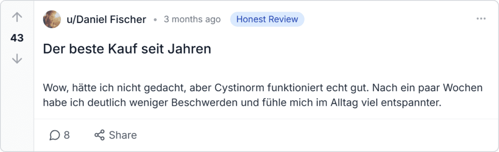 Cystinorm verbindet Wissenschaft mit echten Erfolgen für mehr Energie und Wohlbefinden, wie viele Testimonials bestätigen. Die Nutzer berichten von spürbar besserer Vitalität und einem ausgeglicheneren Alltag durch die konsequente Einnahme.