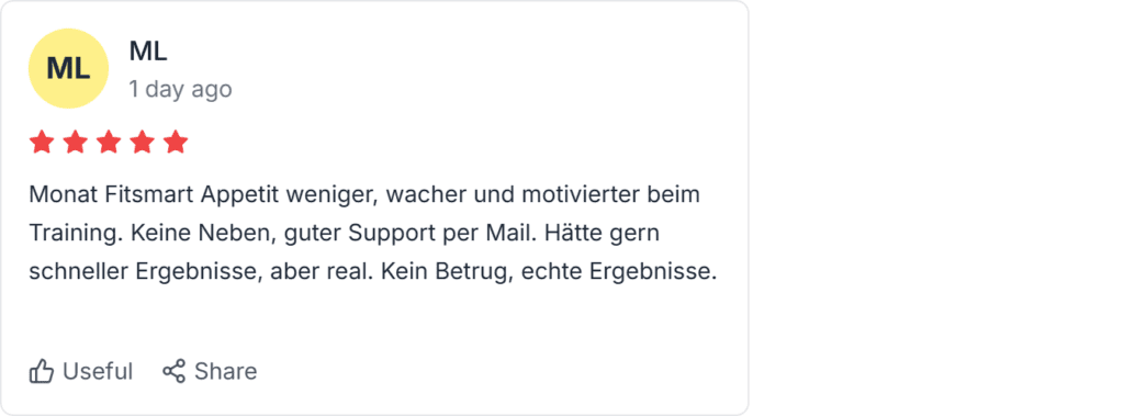 Tausende Fitsmart Erfahrungen und Bewertungen auf Trustpilot (4.9/5) bestätigen 3-7kg Abnehmen in 2-4 Wochen. Erfahrungsberichte aus München bis Berlin loben echte Wirkung, kein Betrug.