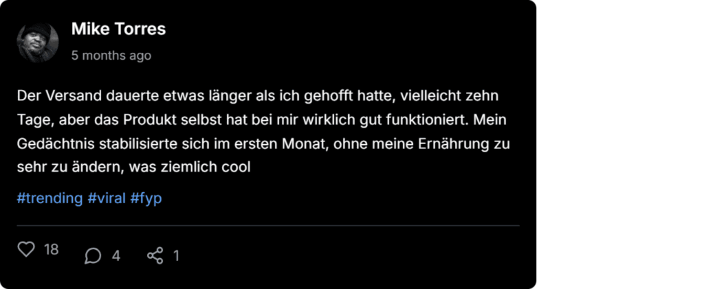 Viele Benutzer berichten von effektiven Gedächtnisverbesserungsergebnissen, wenn sie das Präparat mit einer gesunden Ernährung und regelmäßiger mentaler Aktivität kombinieren.