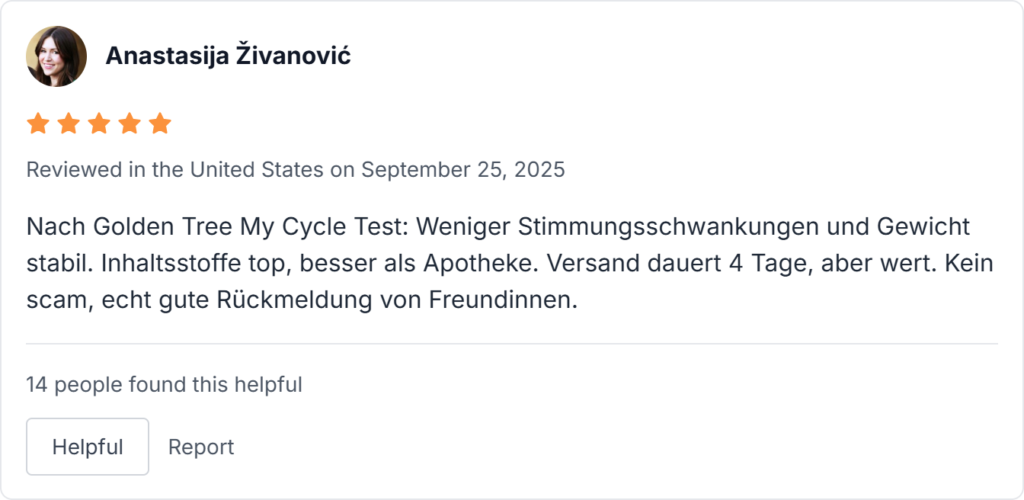 Ja, Nutzer berichten schnelle Linderung bereits nach 2 Wochen. Golden Tree My Cycle Erfahrungen bestätigen Hervorragende Hormonbalance, weniger Schweißausbrüche im Alltag.