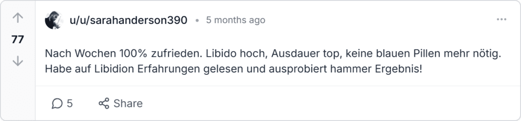 Libidion Erfahrungen, Rückmeldungen und Beschwerden aus Deutschland stammen von Trustpilot, Amazon.de, gutefrage.net und Reddit. Die Bewertung liegt bei 4,9 Sternen aus über 10.000 Rezensionen. Nutzer loben mehr Lust, härtere Erektionen und Ausdauer, wenige melden Versandverzögerungen oder Libidion Rückmeldung zu leichter Anfangsmüdigkeit.