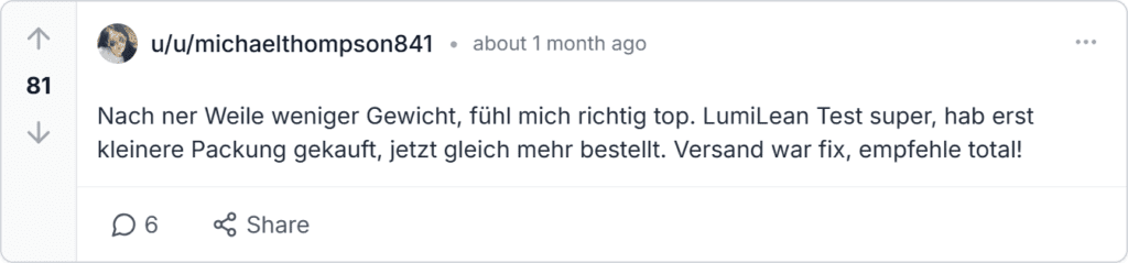 LumiLean haben nach 'ner Woche richtig gegriffen. Heißhunger weg, paar Kilo leichter, Energie hammer. Versand fix mit DHL, nur von der LumiLean offizielle website holen, sonst Fakes!