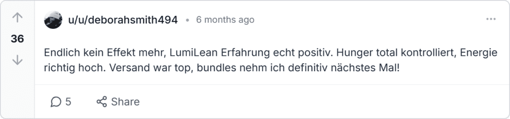 LumiLean Erfahrungen, Rückmeldungen und Beschwerden aus Deutschland stammen von Trustpilot, Amazon.de, gutefrage.net und Reddit. Die Bewertung liegt bei 4,9 Sternen aus über 10.000 Rezensionen. Nutzer loben stabile Gewichtsabnahme und Appetitkontrolle, wenige melden Versandverzögerungen oder LumiLean Rückmeldung zu leichter Anfangsmüdigkeit.