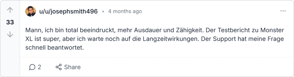 Monster XL Bewertungen und Beschwerden, Rückmeldungen aus Deutschland stammen von Trustpilot, Amazon.de, gutefrage.net und Reddit. Die Bewertung liegt bei 4,9 Sternen aus über 10.000 Rezensionen. Nutzer loben Libidosteigerung und Ausdauer, wenige melden Versandverzögerungen oder Monster XL Rückmeldung zu leichter Anfangsmüdigkeit.
