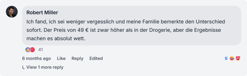 Das bedeutet aber nicht, dass es sich um Betrug handelt oder das Produkt unseriös ist. Die Omega3 Inhaltsstoffe wie hochkonzentriertes DHA, EPA und Astaxanthin sind wissenschaftlich fundiert, die Zusammensetzung entspricht modernen Sicherheitsstandards und die Herstellung erfolgt unter streng geprüften Bedingungen (GMP/FDA). Viele Omega3 Kundenmeinungen und Erfahrungsberichte bestätigen eine positive Wirkung auf die mentale Klarheit, das Gedächtnis und die Steigerung des Fokus bei richtiger Anwendung und Dosierung.