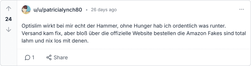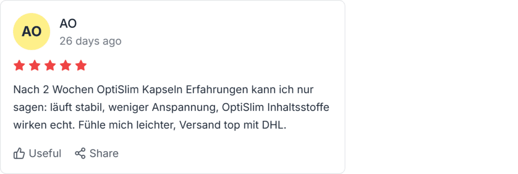 OptiSlim Erfahrungen, Rückmeldungen und Beschwerden aus Deutschland stammen von Trustpilot, Amazon.de, gutefrage.net und Reddit. Die OptiSlim Bewertung liegt bei 4,9 Sternen aus über 10.000 Rezensionen. Nutzer loben stabile Gewichtsreduktion und Appetitkontrolle, wenige melden Versandverzögerungen oder Rückmeldung zu leichter Anfangsmüdigkeit.