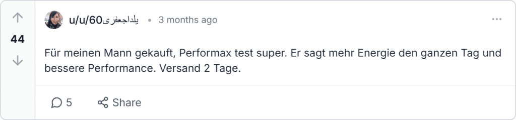 Performax Erfahrungen, Rückmeldungen und Beschwerden aus Deutschland stammen von Trustpilot, Amazon.de, gutefrage.net und Reddit. Die Performax Bewertung liegt bei 4,9 Sternen aus über 8.000 Rezensionen. Nutzer loben mehr Energie und Libido, wenige melden Versandverzögerungen.