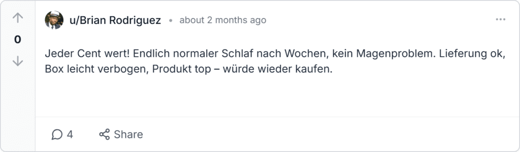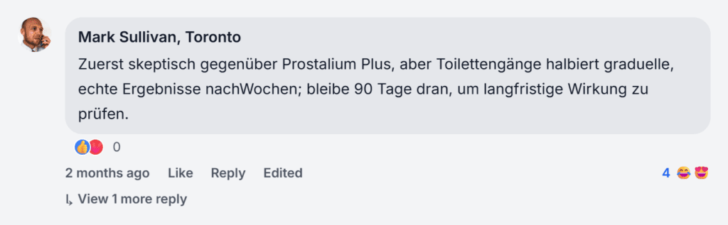 Dauerte ca. einen Monat für echte Veränderung, aber es wirkt. Weniger Dringlichkeit, keine Nebenwirkungen. Prostalium Plus Preis hoch, aber lohnenswert.