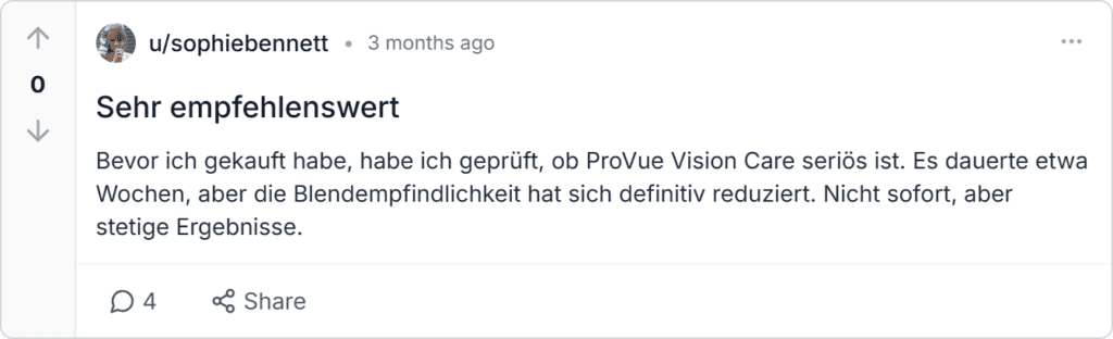 Habe Scam-Warnungen zu ProVue Vision Care gelesen, aber trotzdem ausprobiert. Nach Wochen fast kein Bildschirmbrand mehr. Nachtfahren besser. Schneller Versand, nur offizielle Site.