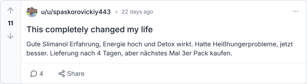 Slimanol Erfahrungen und Rückmeldungen aus DE dominieren Trustpilot und Amazon.de – hier echte Slimanol Bericht von Nutzern. Gemischte, aber meist positive Stimmen.