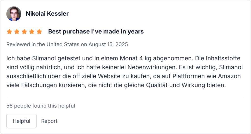 Ich habe Slimanol getestet und in einem Monat 4 kg abgenommen. Die Inhaltsstoffe sind völlig natürlich, und ich hatte keinerlei Nebenwirkungen. Es ist wichtig, Slimanol ausschließlich über die Slimanol offizielle Website zu kaufen, da auf Plattformen wie Amazon viele Fälschungen kursieren, die nicht die gleiche Qualität und Wirkung bieten.