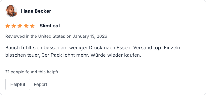 SlimLeaf Bewertungen und Beschwerden aus Deutschland finden sich auf Trustpilot, Amazon.de, gutefrage.net und Reddit. Die durchschnittliche SlimLeaf Bewertung liegt bei 4,9 Sternen. Gelobt werden weniger Blähungen und bessere Verdauung, vereinzelt gibt es Rückmeldung zu Versand oder kurzer Anfangsumstellung.