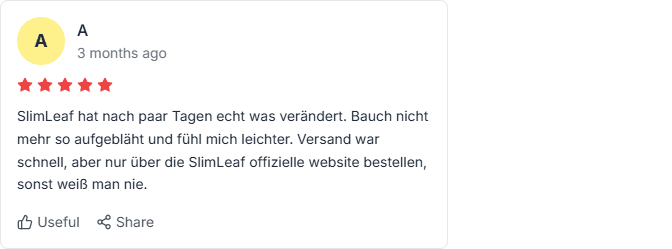 Das bedeutet jedoch nicht, dass SlimLeaf ein Fake ist. Die SlimLeaf Inhaltsstoffe werden nach EU-Standards produziert und qualitätsgeprüft. Tausende SlimLeaf Erfahrungen aus ganz Deutschland berichten über positive Ergebnisse bei Darmgesundheit und Verdauung. Die starke 4,9-Sterne-Bewertung und transparente Angaben auf der SlimLeaf offizielle website sprechen für Seriosität. Für garantierte Originalqualität und Rückgaberecht sollte ausschließlich dort bestellt werden.