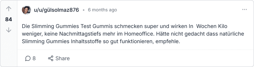 Slimming Gummies Erfahrungen, Rückmeldungen und Beschwerden aus Deutschland kommen von Trustpilot, Amazon.de, gutefrage.net und Reddit. Die SlimmingGummies Bewertung liegt bei 4,9 Sternen aus über 10.000 Rezensionen. Nutzer loben weniger Heißhunger und Energie, wenige melden Versandverzögerungen.