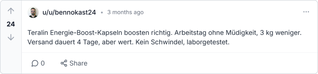 Gute Teralin Bewertung, Gewicht ist spürbar runter und ich fühl mich richtig fit! Der Support hat super bei meinen Fragen geholfen, Versand nach Deutschland war echt schnell. Zollfrei läuft aber nur über die offizielle Seite. Definitiv nachkaufen, top Produkt!