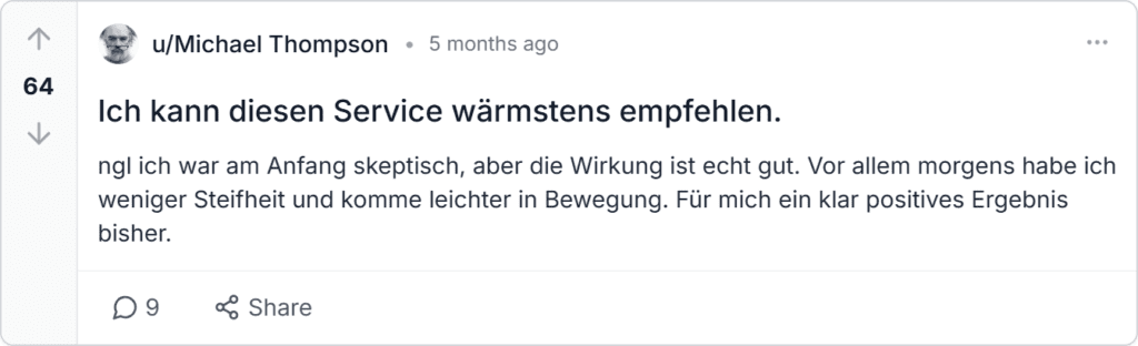 Ergebnisse im Alltag: Viele Nutzer berichten von weniger Steifheit nach einigen Tagen und besserer Beweglichkeit bei regelmäßiger Anwendung.