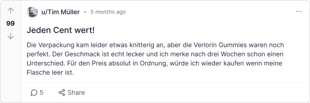Verlorin Bewertungen und Beschwerden aus Deutschland stammen von Trustpilot, Amazon.de, gutefrage.net und Reddit, mit einer Gesamtbewertung von 4,8 Sternen aus tausenden verifizierten Erfahrungen.