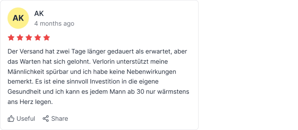 Das bedeutet jedoch keinesfalls, dass es sich um ein Fake-Produkt handelt, denn die Inhaltsstoffe von Verlorin entsprechen vollständig EU-Richtlinien und werden qualitätsgeprüft auf Basis wissenschaftlich untersuchter Nährstoffe hergestellt. Zahlreiche Erfahrungen aus ganz Deutschland berichten über positive Resultate bei der Unterstützung der männlichen Potenz. Die starke Bewertung von 4,8 Sternen spricht für eine solide Reputation, weshalb Bestellungen ausschließlich über die Verlorin offizielle Website erfolgen sollten.