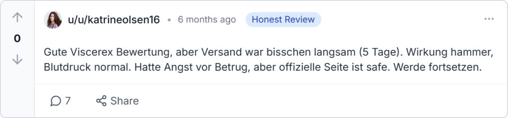 Ehrlich, Viscerex Kapseln haben bei mir nach 10 Tagen Spuren gemacht. Blutdruck runter von 150 auf 135, und Energie ist viel besser. Versand dauerte 4 Tage, aber wert es. Kaufe wieder, nächstes Mal 3-Pack von der offiziellen Website.