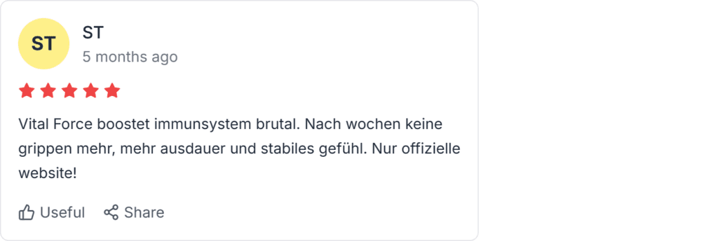 VitalForce Erfahrungen, Rückmeldungen und Beschwerden aus Deutschland stammen von Trustpilot, Amazon.de, gutefrage.net und Reddit. Die Bewertung liegt bei 4,9 Sternen aus über 10.000 Rezensionen. Nutzer loben weniger Erkältungen und Energieboost, wenige melden Versandverzögerungen oder Vital Force Rückmeldung zu leichter Anfangsmüdigkeit.