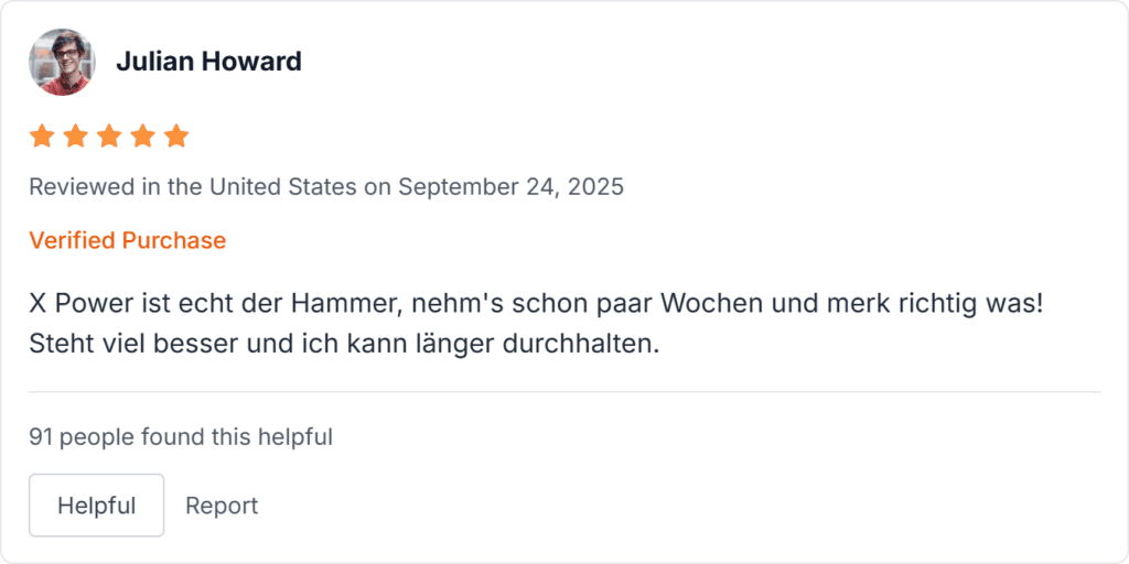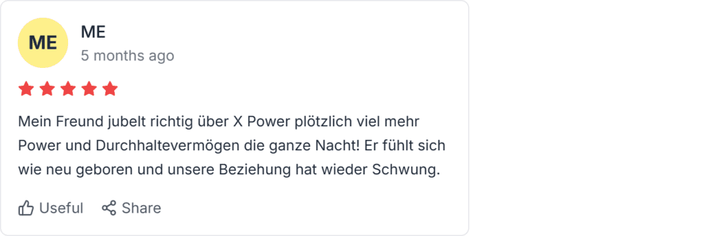 X Power Erfahrungen und Rückmeldungen aus Deutschland fallen positiv aus Nutzer loben festere Erektionen, mehr Libido und bessere Stamina in X Power Berichten auf Trustpilot. Wenige Beschwerden drehen sich um Versand, doch die meisten melden echte Verbesserungen. Hier echte X Power Erfahrung Berichte mit X Power Rückmeldung.