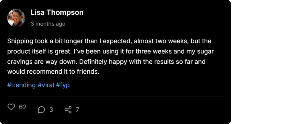 Progressive Results Timeline: Users often notice better energy in week one, reduced cravings by week two, and improved metabolic balance over continued use.