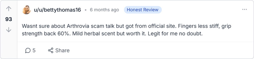 Doubts from Arthrovia Joint Pain Relief reddit but tried it, hip flex better alot. Less ache after golf. Support answered query same day. Reordering no issues here.