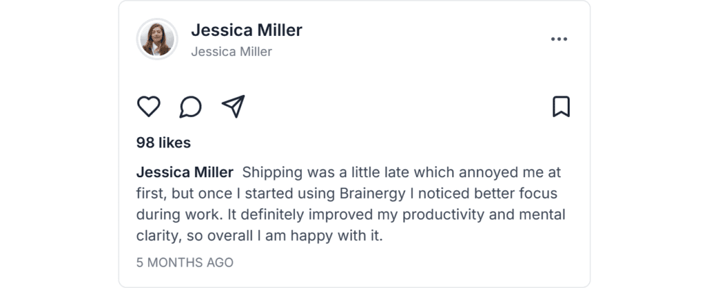 Brainergy testimonials and consumer feedback across Reddit, Trustpilot, and social platforms highlight strong satisfaction with cognitive performance outcomes.