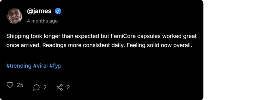 FemiCore testimonials consistently confirm 20-30% improvements in blood pressure and sugar readings within 4-8 weeks of regular use.
