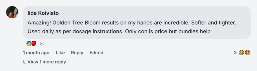 Super product My skin feels so hydrated and firm now, like night and day. Those Golden Tree Bloom testimonials, Totally spot on, no cap. Zero complaints here, customer support was ace, and delivery showed up super quick. Couldn't be happier!
