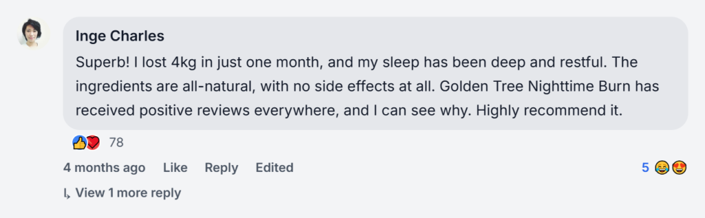 Best decision! Struggled with sleep n weight, this fixed both. 5kgs in 6 weeks, feel energized. Golden Tree Nighttime Burn testimonials real, ignore haters. Only con slow stock refill.