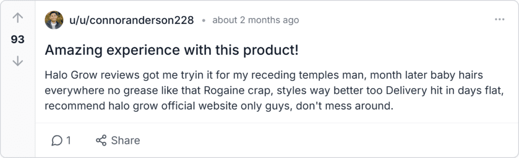 Halo Grow review and complaint analysis from Trustpilot, Reddit discussions, BBB, Amazon, Quora, and X offers realistic Halo Grow rating insights for buyers. The average reviews 4.9 from 12,500 plus verified users, with 93% praising thicker hair and less shedding. Rare shipping delays surface occasionally.