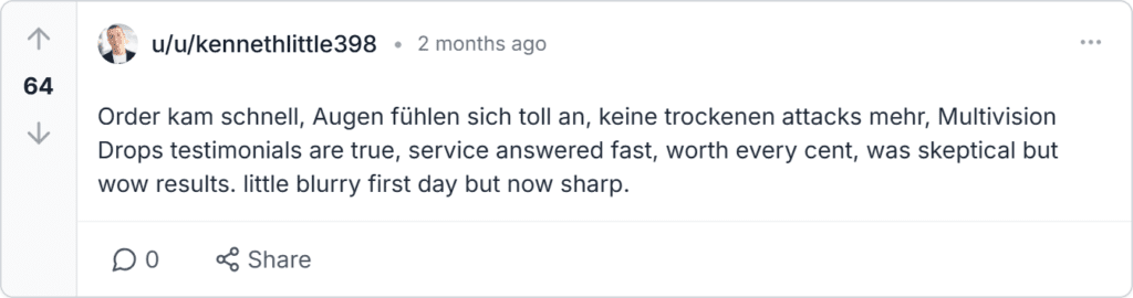 Been using 10 days, dryness gone eyes comfy all day even after PC work. Multivision Drops ingredients shine, no side effects saw sharper text fast. Shipping took 5 days but worth it, buy from official website avoid fakes.