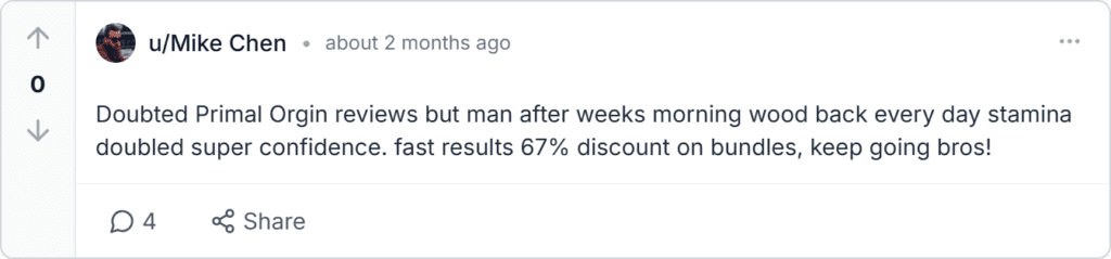 Primal Orgin reviews analysis from Trustpilot, Reddit, BBB, Amazon, Facebook, and Quora provides key 2026 insights into real performance. Reviews average 4.9 stars from 2,847 plus verified buyers, with 89% praising libido surge, erection firmness, and stamina without jitters. Rare complaints focus on initial adaptation glowing Primal Orgin testimonials dominate effectiveness discussions from official channels.