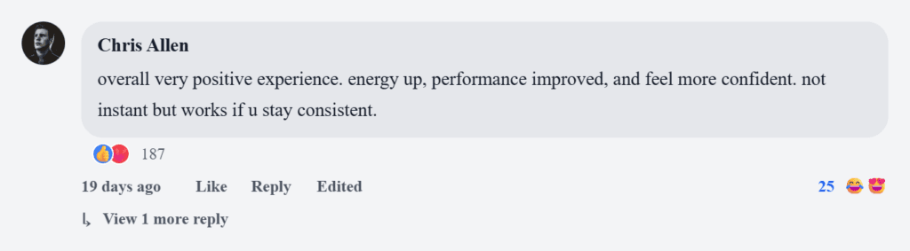 Some users notice increased energy within the first 1–2 weeks, while more visible improvements in stamina and performance may take 3–4 weeks.