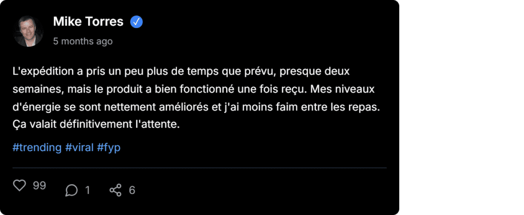 De nombreux utilisateurs rapportent une amélioration efficace du contrôle de l’appétit et de l’énergie stable, soutenus par des avis positifs.