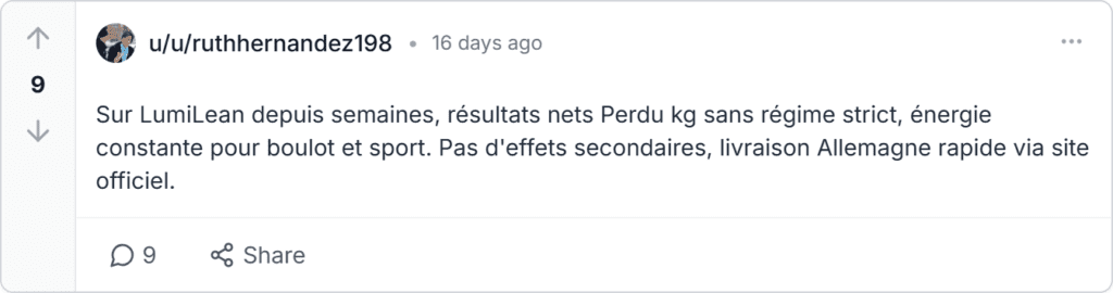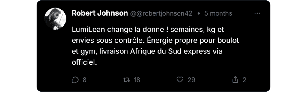 J’ai essayé LumiLean après un régime et j’ai perdu du poids en quelques semaines sans avoir faim. J’ai retrouvé de l’énergie pour le travail et les enfants. Livraison rapide aux États-Unis. Uniquement sur le site officiel, attention aux contrefaçons d’Amazon.