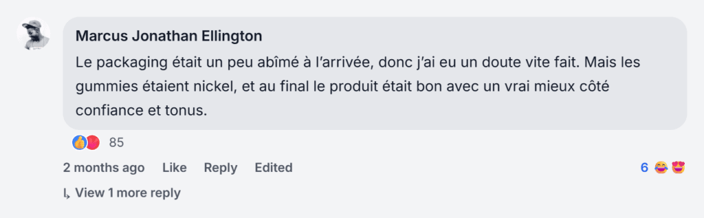 Wow, franchement super retour pour moi. Après quelques jours, j’ai senti plus d’énergie, plus de drive et une vraie différence côté confiance. Les gummies sont faciles à prendre et je recommanderais clairement ce produit.