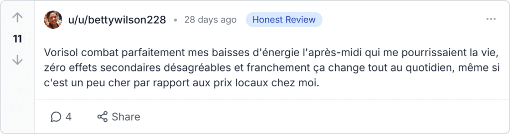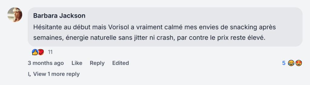 Le soutien de Vorisol sur l’énergie et l’appétit a été super consistant pendant semaines avant que je voie des changements réels sur ma balance et mon endurance quotidienne, et le support client a été vraiment utile pour mes questions.